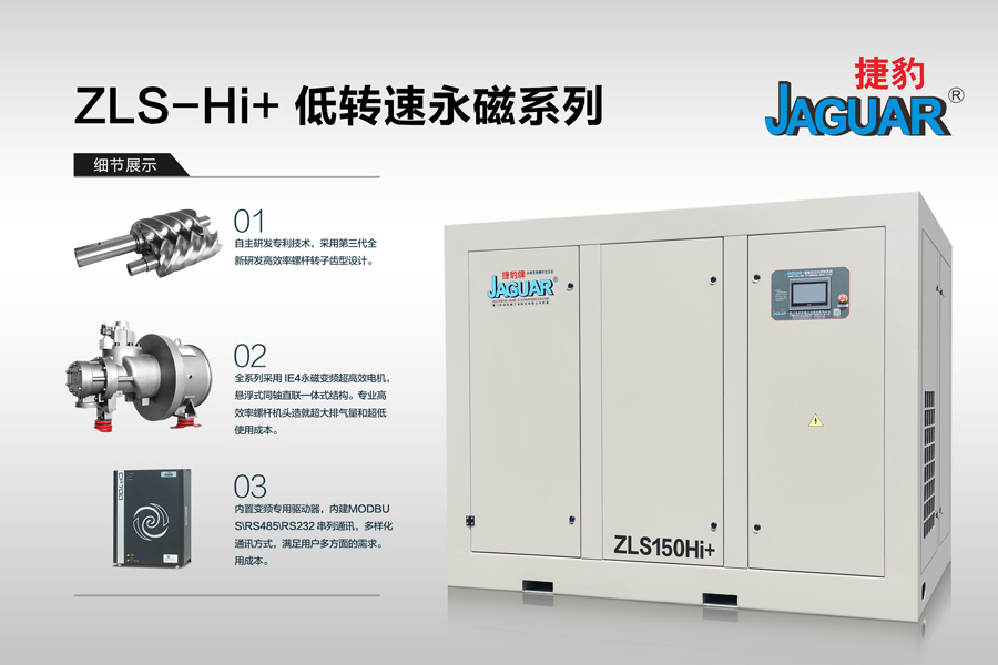全新捷豹永磁變頻HI+系列,采用全新優(yōu)化螺桿機頭,更高的效率,更低的轉(zhuǎn)速,更大的螺桿機頭,全新設(shè)計的永磁電機,一切為客戶量身定制,絕無僅有的全新永磁螺桿式空氣壓縮機!